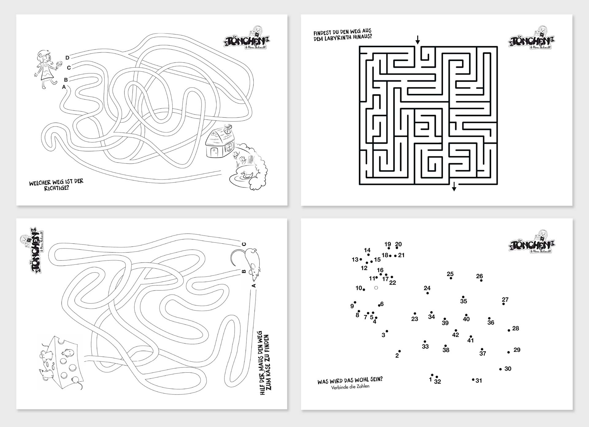 In der Tüte erwarten Dich tolle Rätsel und 4 Ausmalbilder (21 x 14,8 cm) und natürlich auch die dazu nötigen Buntstifte.