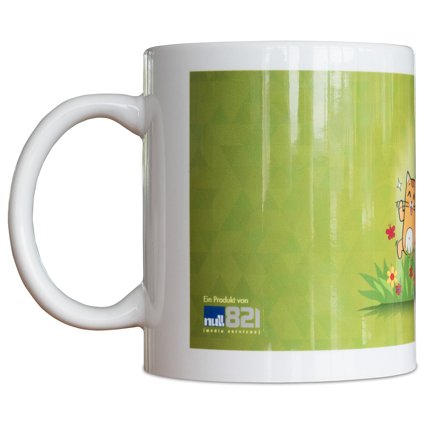 Weiße Porzellantasse mit Henkel und 4-farbigen Aufdruck (spülmaschinenfest).